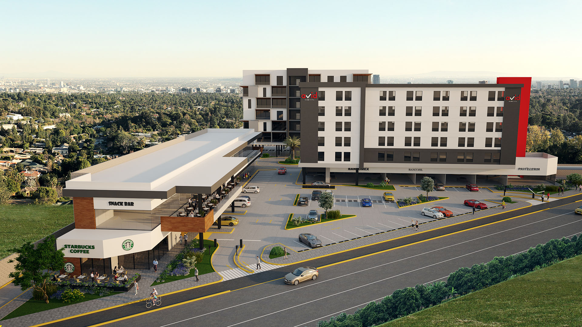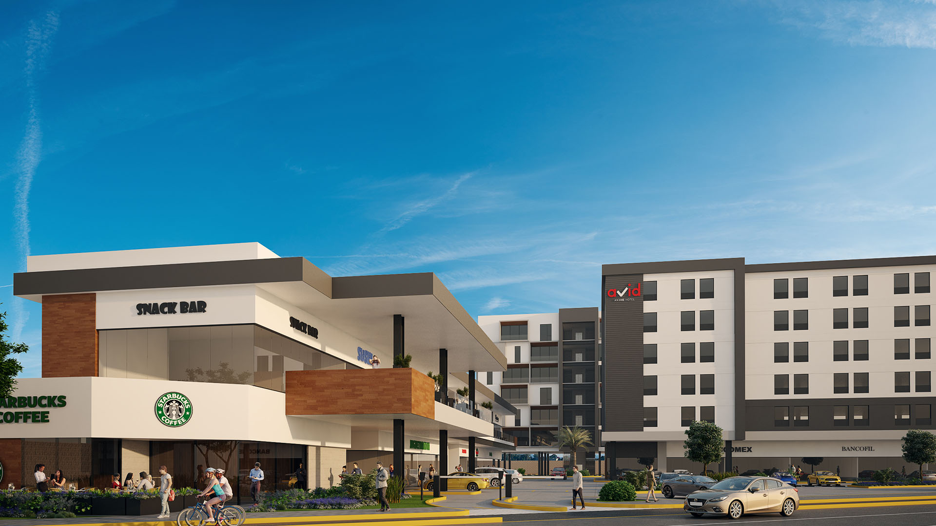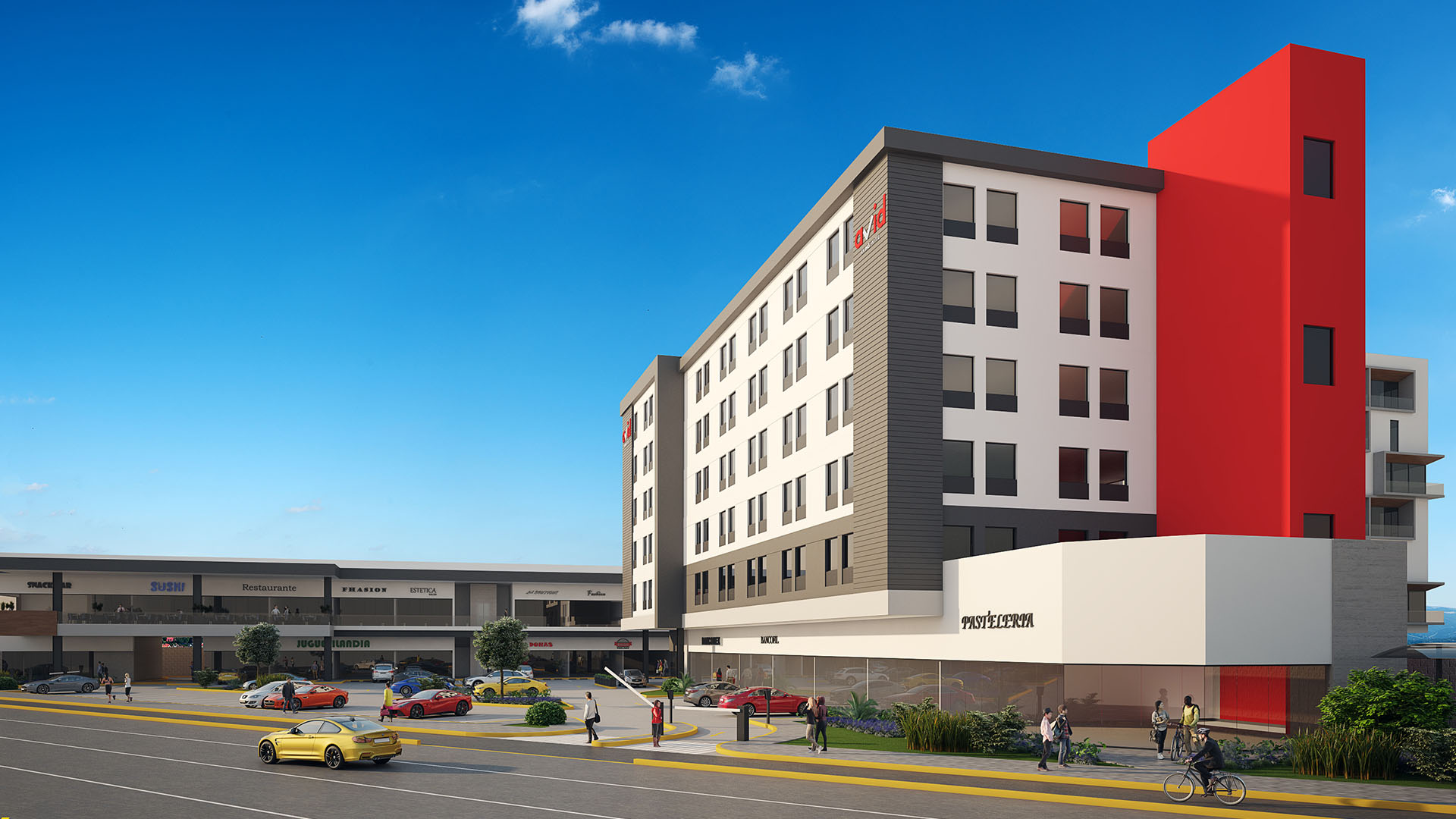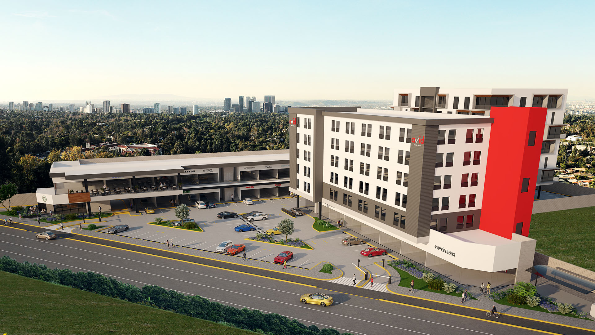 Proyecto ejecutivo de plaza comercial ubicada en Tlajomulco, Jalisco. Proyecto de usos mixtos, proyectando un hotel, residencial y comercial, en un terreno con una superficie de 8,841.10 m², un área comercial rentable de 2,998.42 m² de construcción. 26 locales comerciales y 232 espacios de estacionamiento.